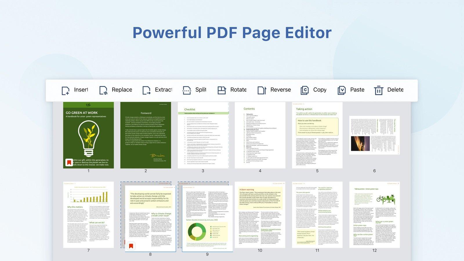 • A PDF page editor lets you organize, insert, extract, replace, and delete PDF pages